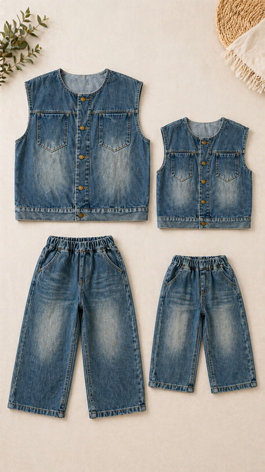 سترات متطابقة للعائلة من الدنيم المغسول - طبقة بلا أكمام