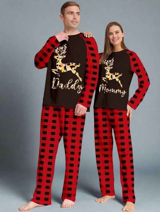 Family Matching Christmas Pajama Set - Red Buffalo Plaid with Reindeer Print in Black & Gold for Cozy Holiday Nights