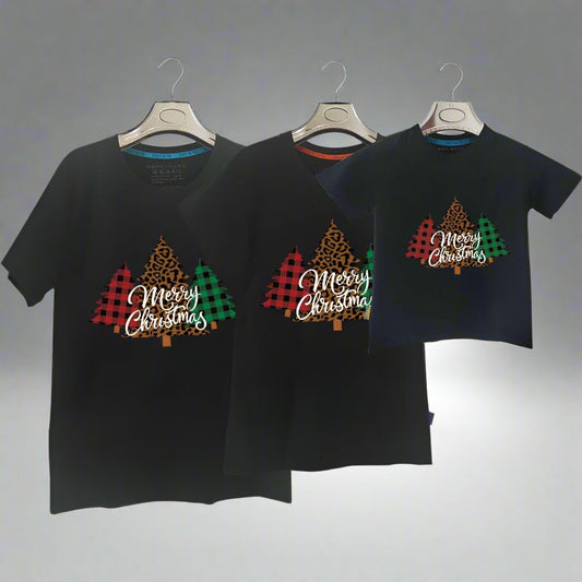Family Matching Christmas T-Shirts – Plaid & Leopard Tree Design