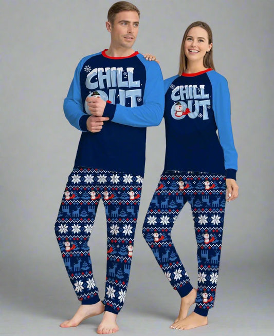 Family Matching Winter Pajama Set - "Chill Out" Snowman Print with Cozy Blue Snowflake Design