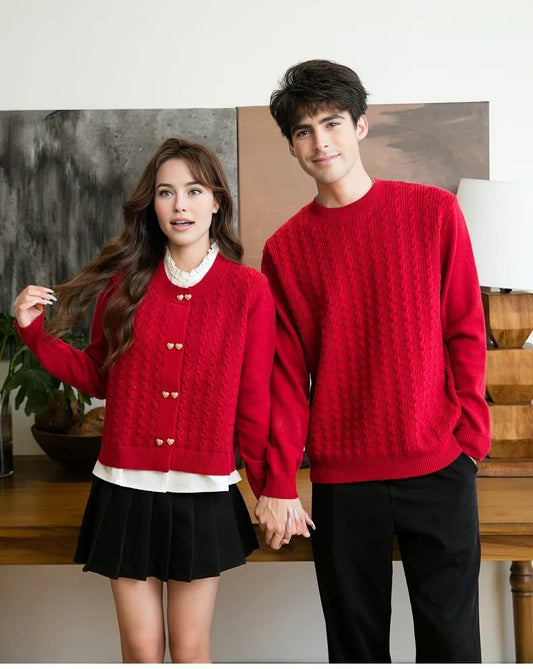 Family Matching Red Cable Knit Cardigans – Elegant Heart-Button Design