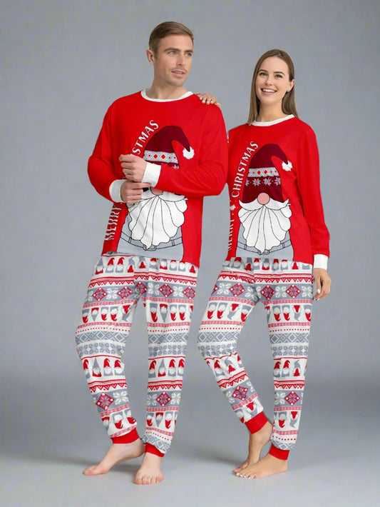 Family Matching Christmas Pajama Set - Festive Santa Gnome Print in Red and Grey with Cozy Nordic Pattern Pants