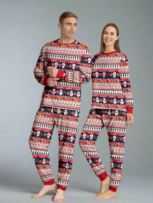 Family Matching Christmas Pajama Set - Festive "Happy Holidays" Snowman & Reindeer Print with Red Cuffs