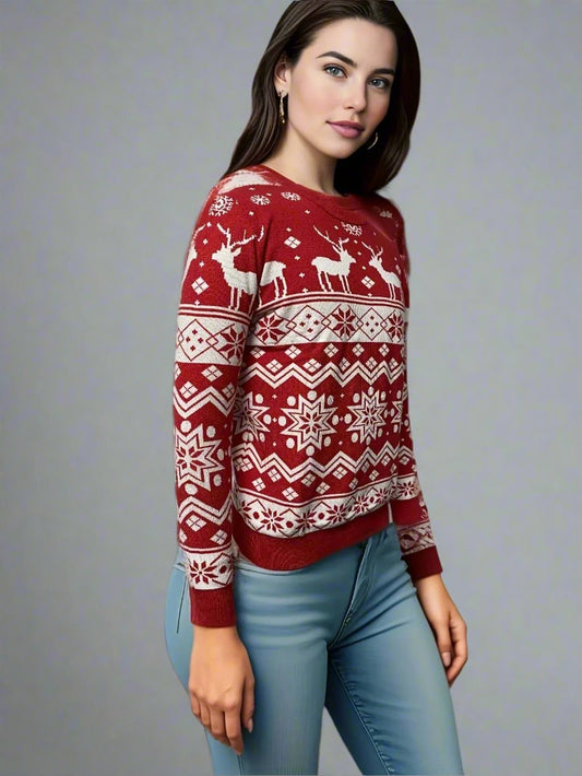 Matching Family Christmas Sweaters – Festive Red with Reindeer and Snowflake Pattern