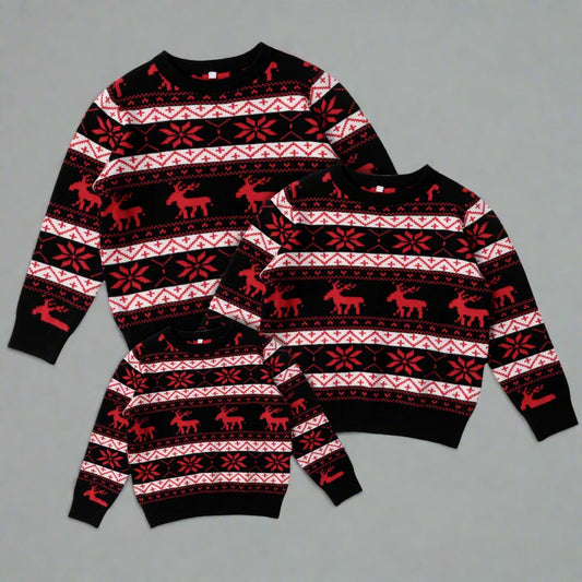 Matching Family Christmas Sweaters – Black with Festive Red Reindeer and Snowflake Design