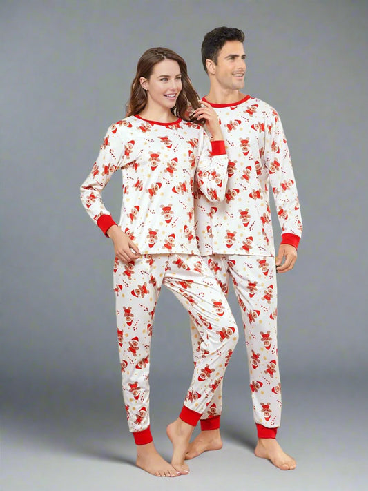 Family Matching Christmas Pajama Set - Cute Santa & Reindeer Print in White with Festive Red Accents