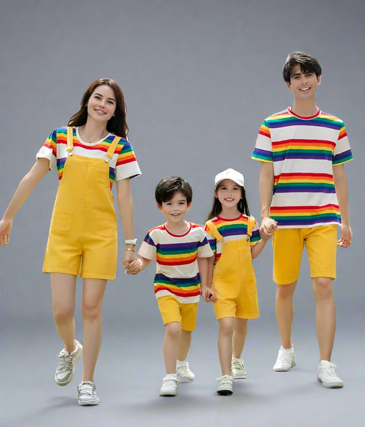 Vibrant Rainbow Family Matching Outfits Striped T-Shirts and Yellow Overalls Set for Family Outings