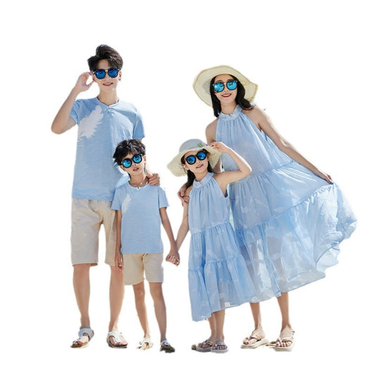 Elegant Matching Family Outfits Light Blue Halter Dresses & Casual T-shirt Set for Summer