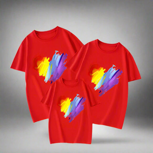 Family Matching T-Shirt Set with Colorful Heart Brushstroke Design