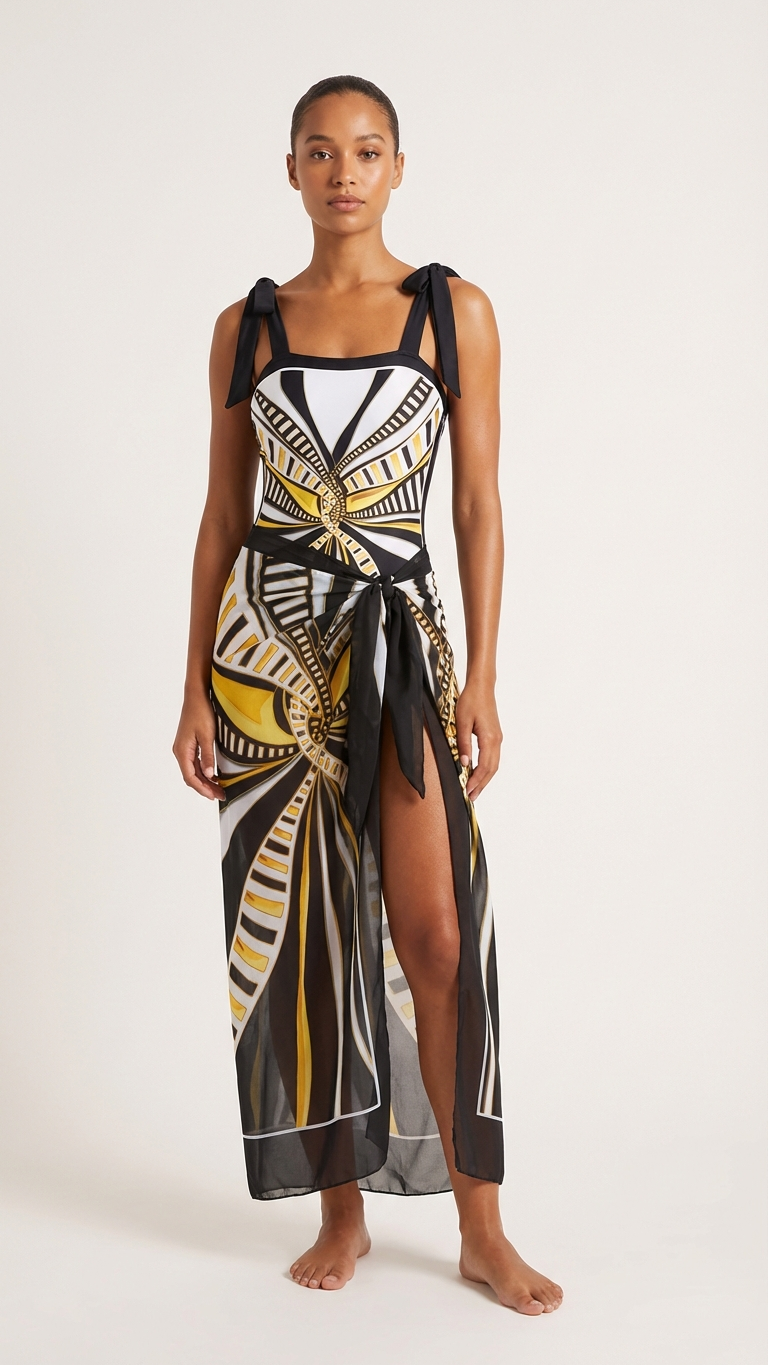 Crea recuerdos inolvidables con nuestro conjunto madre-hija de traje de baño de una pieza y falda de malla estampada. El traje de baño presenta un llamativo diseño geométrico con un nudo central que atrae todas las miradas y crea una silueta favorecedora. La ligera falda de malla a juego añade un toque de elegancia y es perfecta para un paseo por la playa o una cena informal junto al mar.