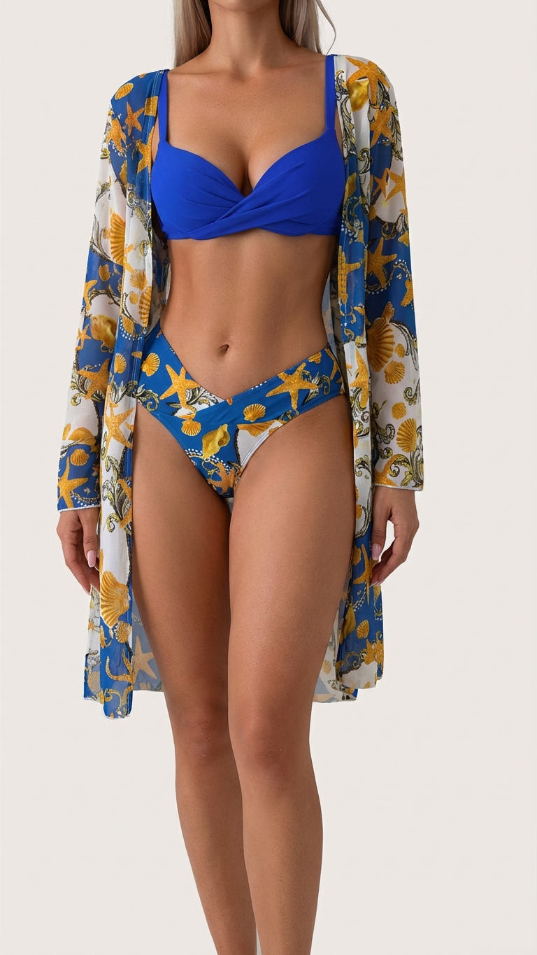 This set includes a stylish two-piece swimsuit and a matching long-sleeved cover-up, providing both protection and flair with its eye-catching design.